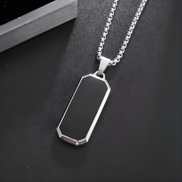 A sleek Black tag pendant with a black onyx inlay on a polished stainless-steel chain.